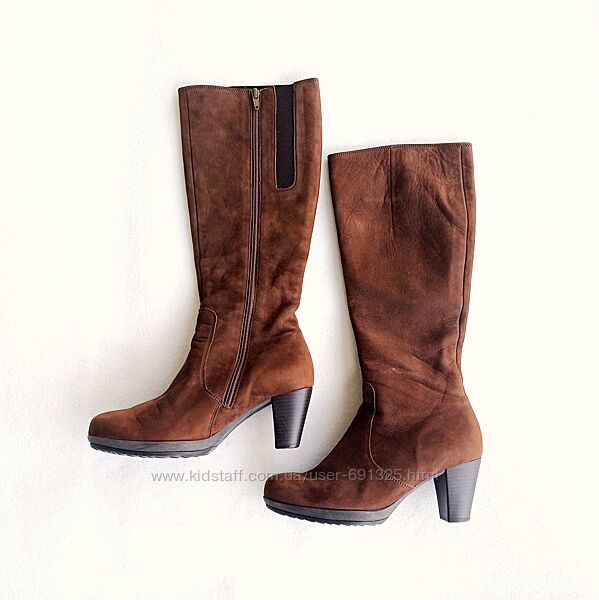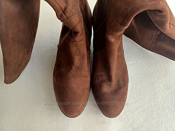 Пропоную демісезонні чоботи з натуральної замшевої шкіри (гладкий нубук) Gabor. Уживані 1 раз акуратно, стан відмінний, на жаль не підійшов розмір.Розмір вказаний 5, довжина устілки всередині 25 см, ширина 8,5 см, каблук 7 см, з них платформа 1,5 см, висота від підлоги 45 см, окружність верха 37+2 см, окружність щиколотки 26 см.