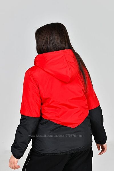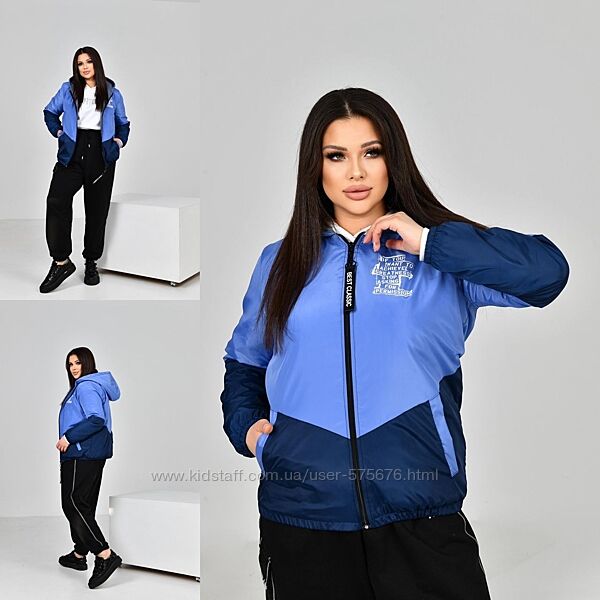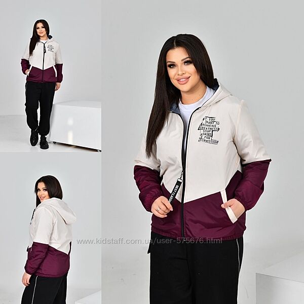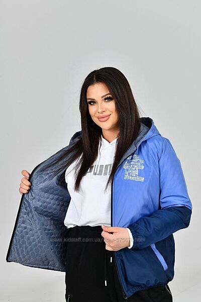Куртка на паяному синтепоні. Виріб вільного силуету, виконано з двох тонів, з капюшоном. Оздоблено принтованим надписом, має дві кишені з обох боків, застібка на блискавці, рукав на резинці.