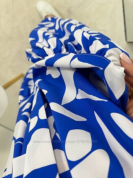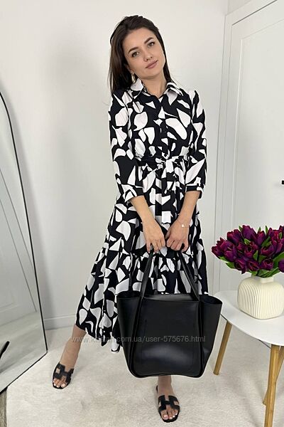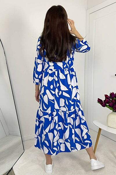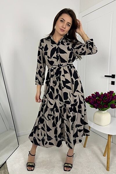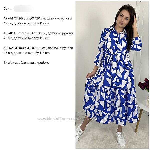 Сукня вільного крою, комір стійка, застібається зверху на гудзики. Пояс йде окремо, не пришитий, рукав 3/4 (застібається на гудзик)Тканина софт