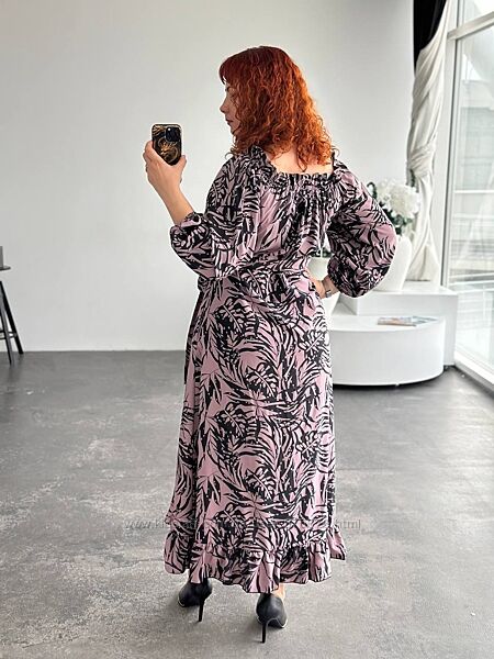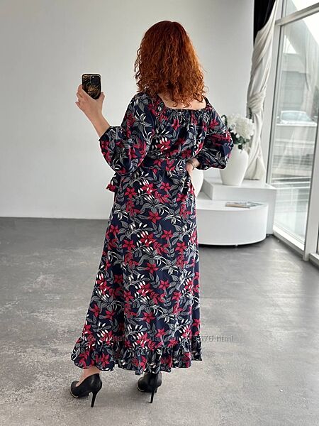 Неймовірно гарна довга сукня у вечірньому стилі. Ліф сукні зібраний на резинку, можна спускати на плечі, попереду декоративна зав´язка. Рукав довгий,по низу зібраний на резинку. Сукня по лінії талії відрізна. Спідниця сукні з імітацією запАху. прикрашена воланом. В бічних швах оброблені кишені. Пояс із основної тканини в комплекті.