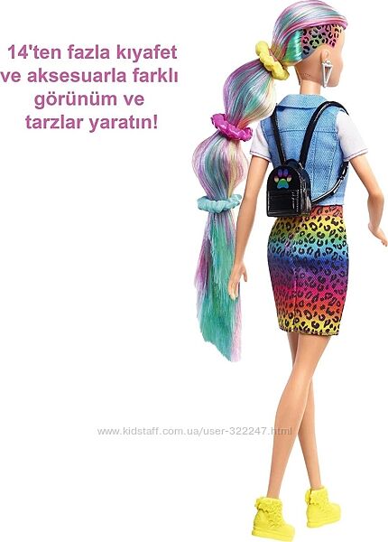 Лялька Barbie Leopard Rainbow Hair поставляється з цими суперстильними речами, які ідеально підходять для молодих стилістів і модних розваг: 2 шпильки, 3 браслети-резинки (також працюють з волоссям ляльки Барбі), гумки для волосся, щіточка, футболка з сердечком, джинсовий жилет , котячі вушка, кошачий гаманець, намисто, рюкзак, додаткова пара взуття, губка для функції зміни кольору та контейнер для крижаної води