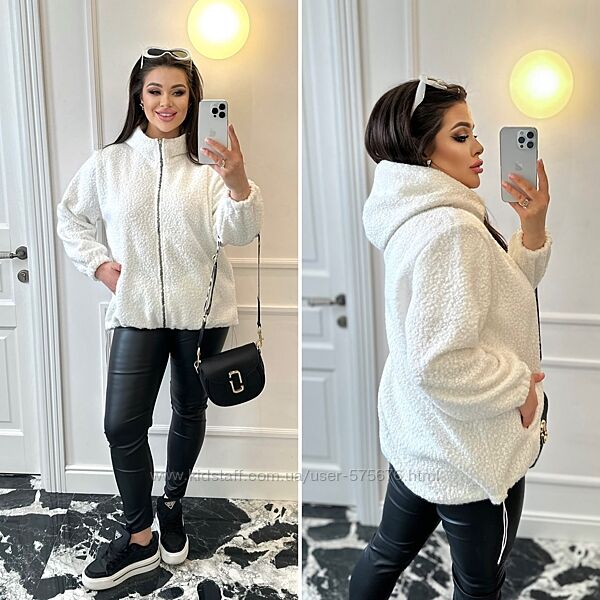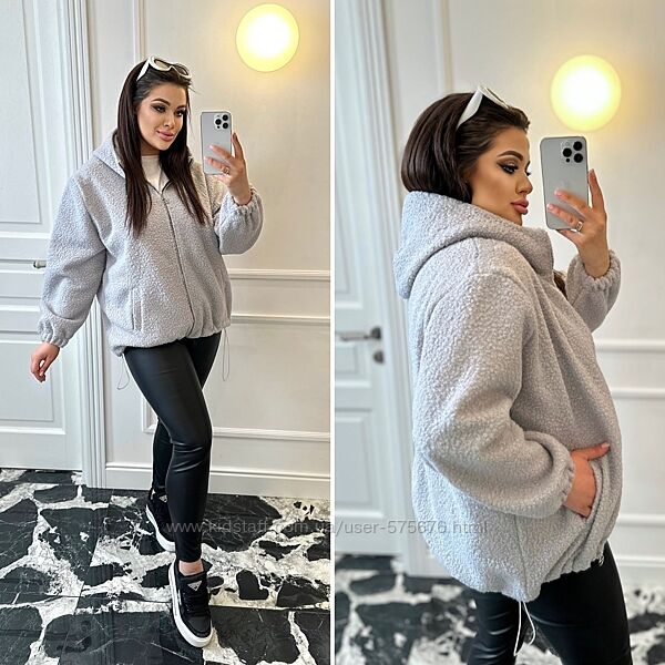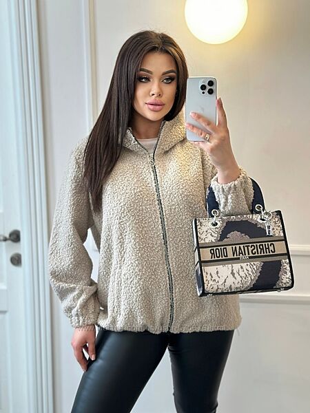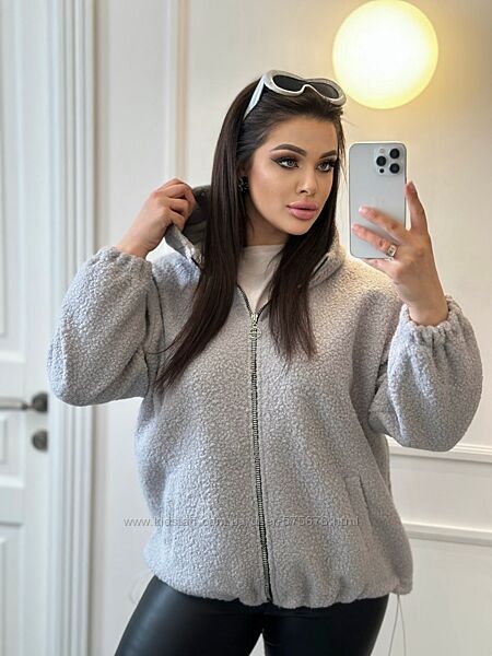 Стильна куртка вільного силуету із якісного буклє «баранець» ( розтяжність мінімальна). Лінія плеча спущена, рукав на резинці. Капюшон зі стійкою, щоб краще захищати горло під час вітряної погоди. Куртка застібається на блискавку. Низ на кулісці з резинкою та стопорами, щоб можна було затягувати. Попереду оброблені кишені. Без підкладки.
