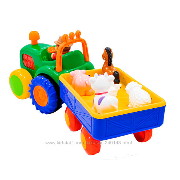 Дитина самостійно може штовхати трактор, знімати та розташовувати фігурки, натискати на певні деталі – отримувати відгук у вигляді звуку.