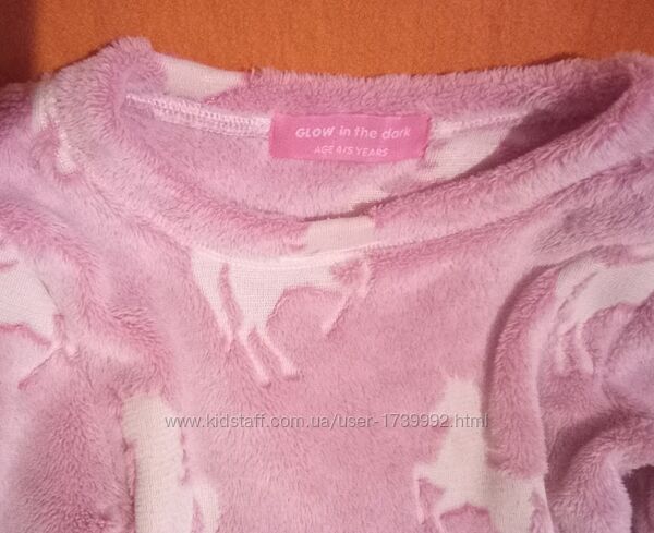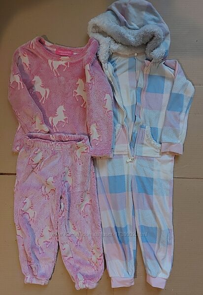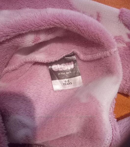Лот піжама, що світиться в темряві і кігурумі, 4-5 роківЦіна за весь лот, в лоті: 1. Волохата рожева піжамка з єдинорогами для дівчинки. Від Glow in the dark. Без дефектів. 2. Кігурамі флісовий, теплий з капюшоном і кишеньками, George. Без дефектів.
