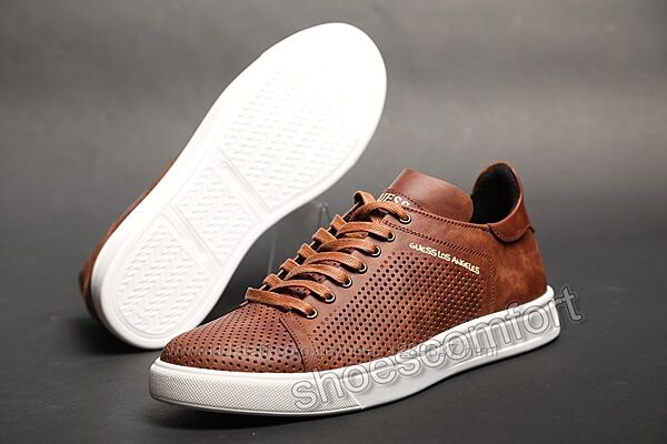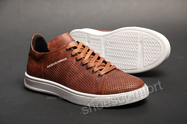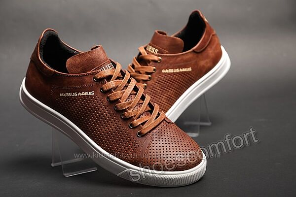 Мужские кожаные кеды с перфорацией Guess Los Angeles коричнево-рыжие на контрастной белой подошве.Стильные и очень удобные кеды изготовлены из высококачественной перфорированной натуральной кожи турецкого производства. Обувь выполнена в лаконичном дизайне, который идеально сочетается с джинсами и любой другой одеждой спортивного стиля.