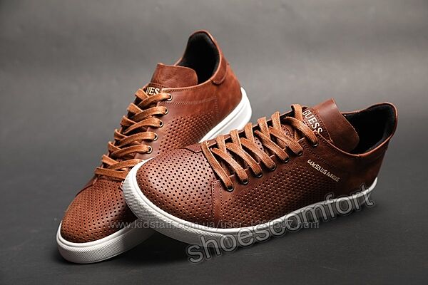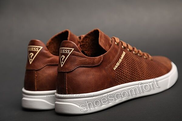 Подробное описание: Кеды кожаные мужские с перфорацией Guess коричнево-рыжие на белой подошве