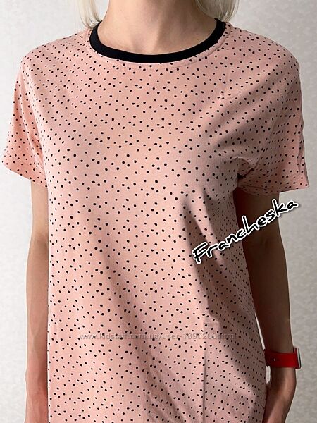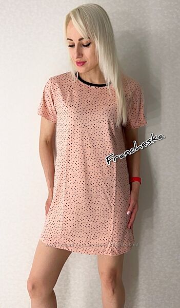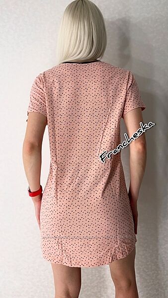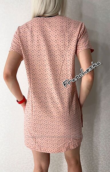 Зручна та легка жіноча нічна сорочка з колекції CARAMEL (LDK 129/08/02) від українського виробника ТМ Gofre (Ellen) у ніжному пудровому кольорі з дрібним чорним горошком- ідеальний вибір для комфортного сну та домашнього відпочинку.Модель має прямий крій, короткі рукави та контрастну чорну окантовку горловини.Виготовлена зі 100% натуральної бавовни, приємна до тіла та добре пропускає повітря.Ідеально підходить для сну та домашнього затишку.
