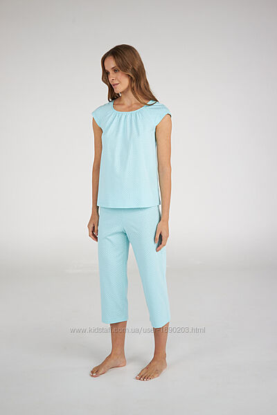 Комплект складається з футболки вільного силуету і прямих капрів. Футболка з коротким рукавом і круглим вирізом горла,бріджи прямого крою з м´якою резинкою в поясі.