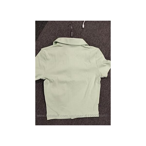 Укорочена довжина та приталений силует. Короткі рукави. Відкритий комір із тієї ж тканини, що й сама футболка. V-подібний виріз без ґудзиків.