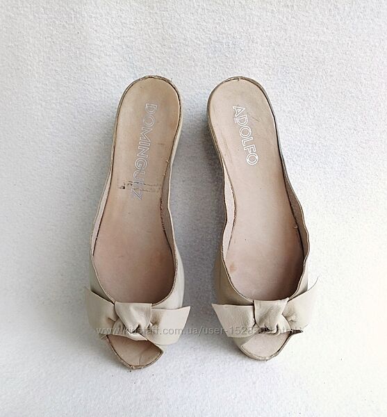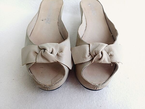 Пропоную сірі шльопанці з натуральної шкіри Adolfo Dominguez. Уживані 1 раз акуратно, мені вузьки. Через те, що рік полежали, мені здається, що вони трохи пожовтіли, але це не дуже помітно, дивіться фото.Розмір вказаний 36, довжина устілки всередині 23 см, ширина 7,3 см, танкетка 5 см, з них платформа 2 см.