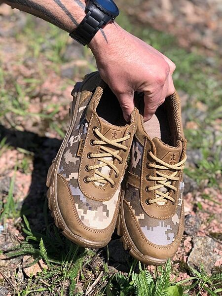 Кросівки військові тактичні койот з натуральної шкіри та кордури піксель. Сезон: весна, літо, рання осіньВерх: натуральна шкіра та повітропроникна тканина кордура.
