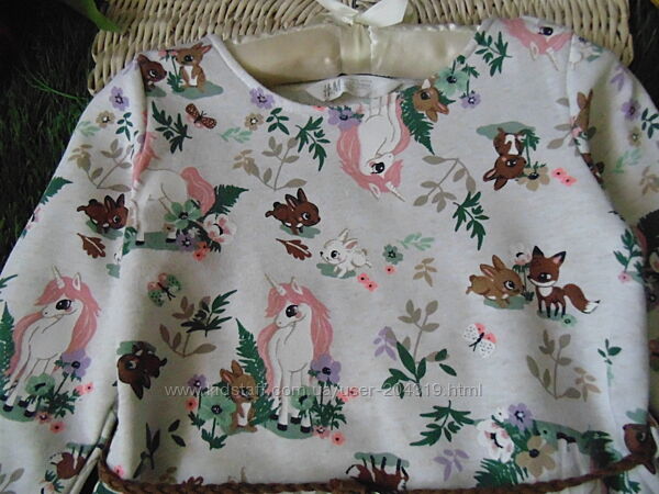 Сукня з м´якого футера H & M з плетеним пояском. Ніжний принт з єдиноріжок та лісових звірят по всій поверхні.