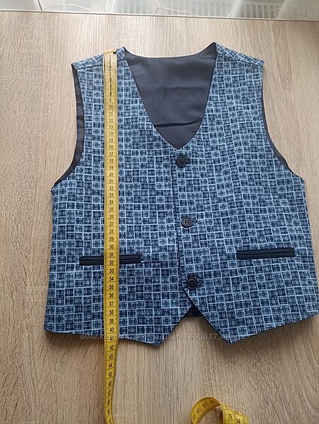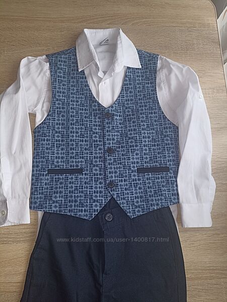 Святковий костюм 6-8 років: сорочка, жилетка, штани, метелик, туфлі 31 розмір.Штани з утяжкою пояса. В сорочці рукав можна закотити і закріпити на гудзик, а можна трохи підкласти манжет як показано на фото.