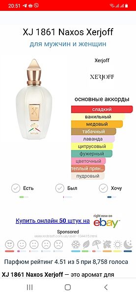 "...XJ 1861 Naxos Xerjoff — это аромат для мужчин и женщин, он принадлежит к группе цитрусовые сладкие. XJ 1861 Naxos выпущен в 2015 году. Верхние ноты: Лаванда, Бергамот и Лимон; средние ноты: Мед, Корица, Кашмеран и Жасмин Самбак; базовые ноты: Лист табака, Ваниль и Бобы тонка...."