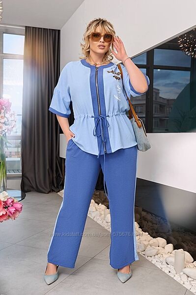 Кофта вільного крою на змійці, на талії затягується на куліску.Спереду декор-накатка. Штани з лампасами, вільного крою, високої посадки, в талії на гумці і з кишенями.
