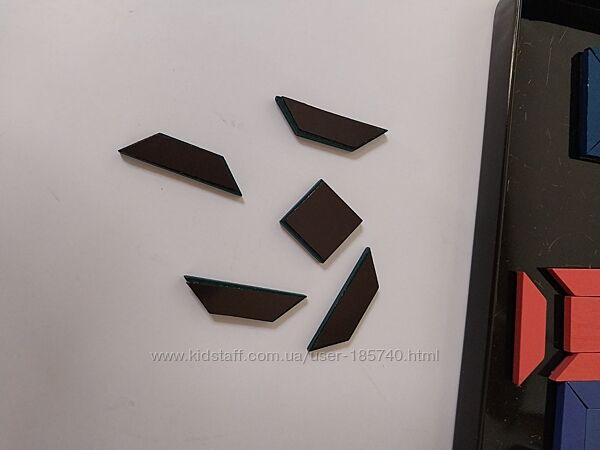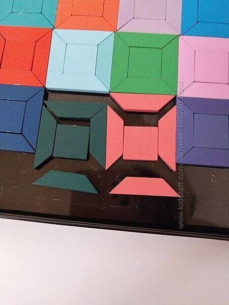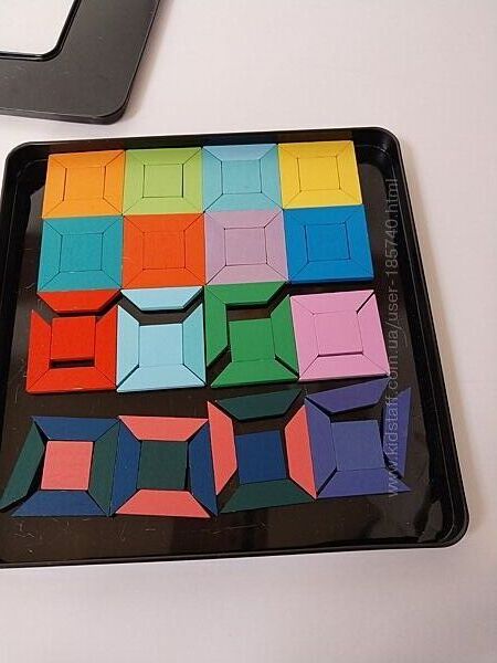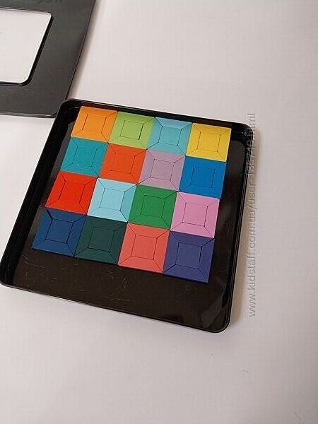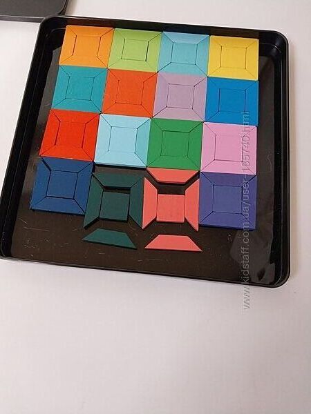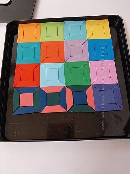 В металевій коробці, в якій можна складати різні комбінації форм і пазлів, дана форма квадрати, складається з квадрата і 4 елементів з боку, можна створювати власні комбінації і візерунки, створювати різноманітні форми і малюнки. Верх елементів дерево, знизу магнітна поверхня. Зручно брати в дорогу, дитина не буде нудитись в машині чи поїзді, елементи чудово кріпляться і не загубляться.Комплект повний, стан елементів добрий, коробочка має подряпинки і вмятинки. Купувались в Америці