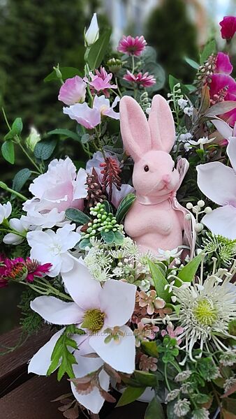Весняна квіткова композиція зі штучних квітів високої якості в біло-рожевих кольорах з білим флокованим кроликом. Ніжна і водночас яскрава. Основа-керамічне кашпо. Чудово буде виглядати також на ресепшн або в офісі. Оплата-100% на картку або післяплата (передоплата 150грн.). Доставка за рахунок отримувача: бажано Новою Поштою (інші варіанти під час обговорення). Зроблено з любов’ю та гарним настроєм. Повернення немає.Другие объявления продавца