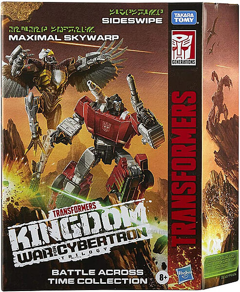 Transformers Generations Kingdom Battle Across Time WFC-K42 Sideswipe & Maximal Skywarp - Это трансформеры Сайдсвайп и Скайварп. Sideswipe превращается из режима робота в режим спортивного автомобиля за 16 шагов. Игрушка Maximal Skywarp, превращается из робота в режим белоголового орла за 22 шага. В комплекте наплечная пушка, бластер и 2 аксессуара для фотонных бластеров.Предназначены для детей от 8 лет.