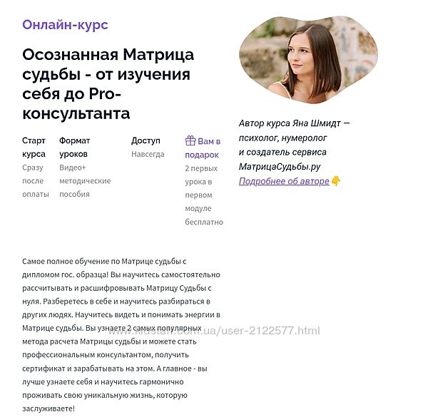 Вы узнаете 2 самых популярных метода расчета Матрицы судьбы и можете стать профессиональным консультантом, получить сертификат и зарабатывать на этом. А главное - вы лучше узнаете себя и научитесь гармонично проживать свою уникальную жизнь, которую заслуживаете!