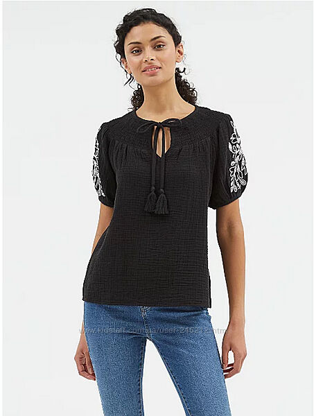 Бавовняна блуза вишиванка George з Англії!Прямий просторий крій, рукави ліхтарики з контрастною білою вишивкою, V-подібний виріз зі шнурком.