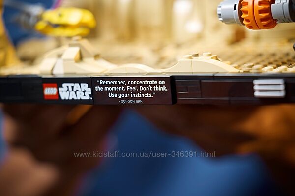 В комплект входит табличка с советом Куай-Гона Джинна («Помни. Сосредоточься на моменте. Чувствуй. Не думай. Доверься своим инстинктам») и кубик LEGO Star Wars, посвященный 25-летию LEGO Star Wars.