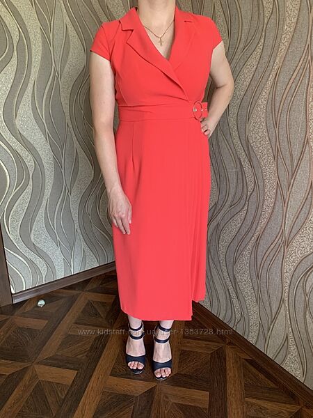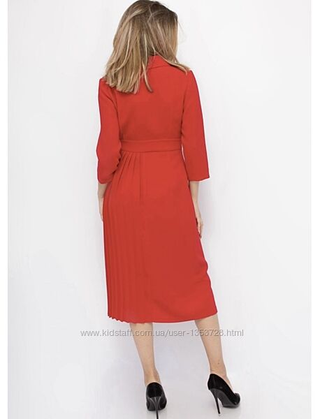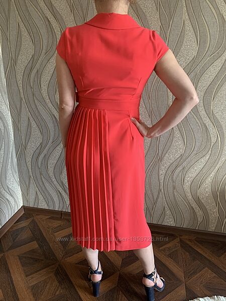 Оригінальна сукня Espiga, виробництво Туреччина. Сукня червоного кольору з плісуванням на спідниці збоку. Застібається сукня на гудзик усередині та ремінь, крій приталений, довжина нижче коліна, спідниця трапеція. Поясок на талії у комплекті. Тканина щільна. Розмір M/38.