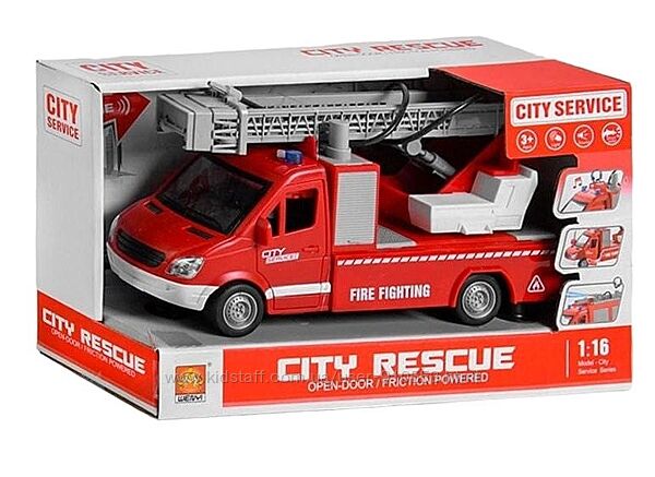 Спецтехніка WY 596 A – це деталізована модель службової техніки із серії "Rescue". Спецтехніка представлена пожежною машиною у масштабі 1:16! Міська служба пофарбована у сигнально червоний колір з білими вставками та написами англійською мовою – City-Service та Fire Fighting.Конструктивні особливості моделі: