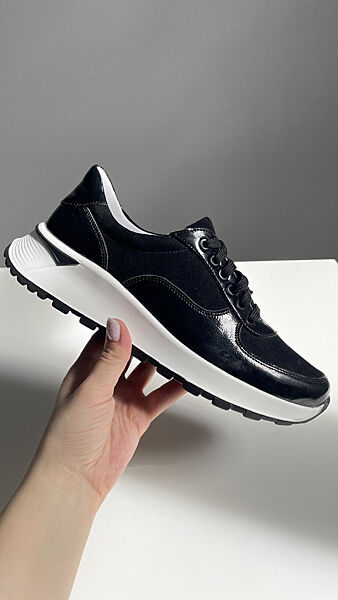 Жіночі стильні кросівки чорні замшеві з шкіряними лаковими вставками, на товстій білій підошві.Верх: натуральна замша та лакована шкіра. Підкладка: текстиль. Устілка: шкіряна.