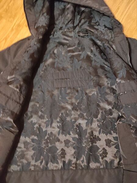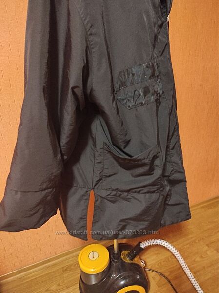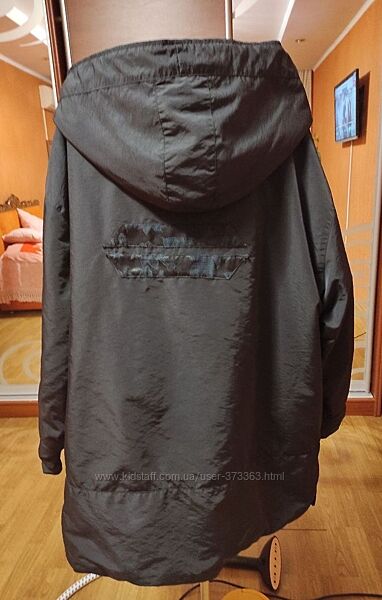 Демисезонная, двухсторонняя куртка - 54/56 разм. Есть тонкая прослойка синтепона, подойдет на +10, +15 градусов. Длина - 85 см Плечи спущены - 60 см, Длина рукава от плеча - 56 см, от горловины - 76 см, ПОГ - 70 см, ПО низа - 74 см, Бицепс - 30 см.