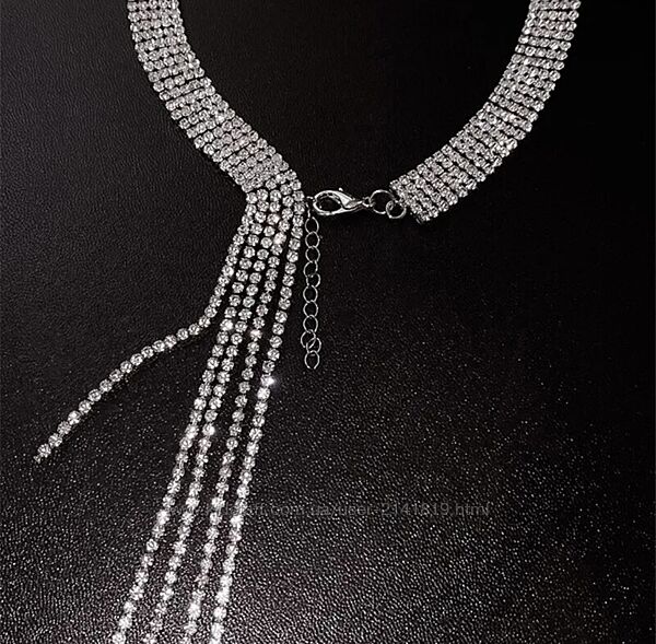 Очень красивый, шикарный длинный чокер со стразами, который придаст яркости Вашему образу.Колье чокер красиво сияет и переливается при свете электрических ламп. Чокер выполнен из пяти рядов блестящих камней, застегивается на карабин, длину можно регулировать.