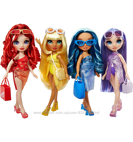 Подружки RAINBOW HIGH їдуть на пляж і готові весело проводити час на золотому піску та купатися у лазурному морі. І в будь-якій ситуації виглядати мегастильно!Зустрічайте нову серію RAINBOW HIGH серії ´Swim & Style´, що складається з 4 лялечок у яскравих купальниках з літними аксесуарами та навіть з парео!