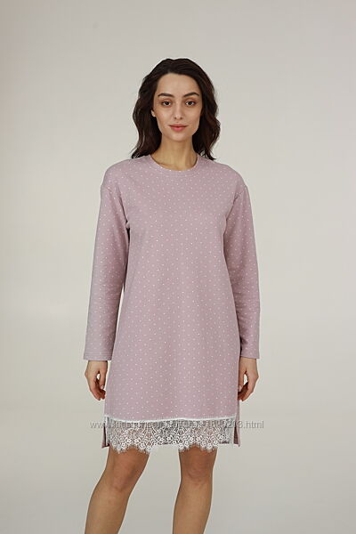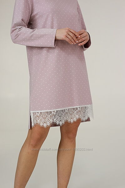 Жіноча бавовняна нічна сорочка з колекції "Praline" від українського виробника ТМ ELLEN можна купити в нашому інтернет-магазині Francheska.Жіноча нічна сорочка (домашня сукня) виготовлена з м´якої якісної бавовняної тканини пудрового кольору в дрібний гороховий принт. Нічна сорочка має вільний силует, з довгими рукавами. Довжина моделі вище колін, має круглий виріз горловини, поличка внизу прикрашена мереживом. Сорочка-сукня дуже красива, комфортна, буде чудовим подарунком коханій та близькій людині.