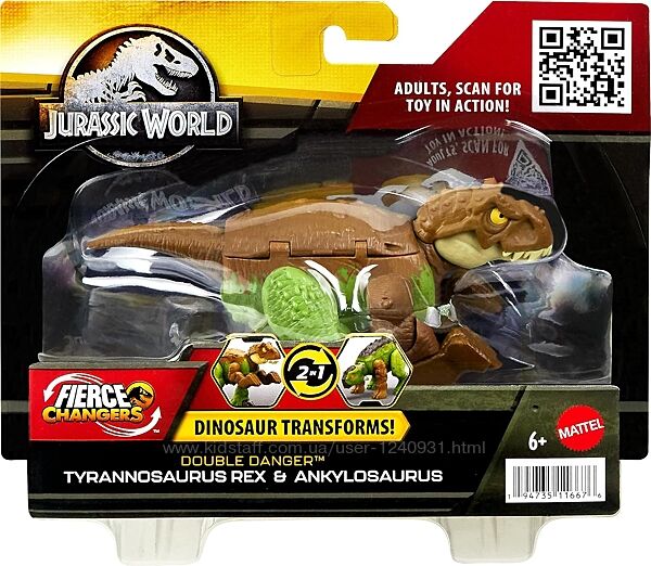 Дві іграшки-динозаври в одній! Чудові відчуття Світу Юрського періоду повертаються додому з цими трансформованими фігурками Подвійної Небезпеки, які перетворюються з одного динозавра на іншого за 11 захоплюючих кроків.Хижак стає травоїдним! Виводячи перетворення іграшок на новий рівень, кожна фігурка перетворюється з м’ясоїдної тварини на травоїдну тварину і назад.