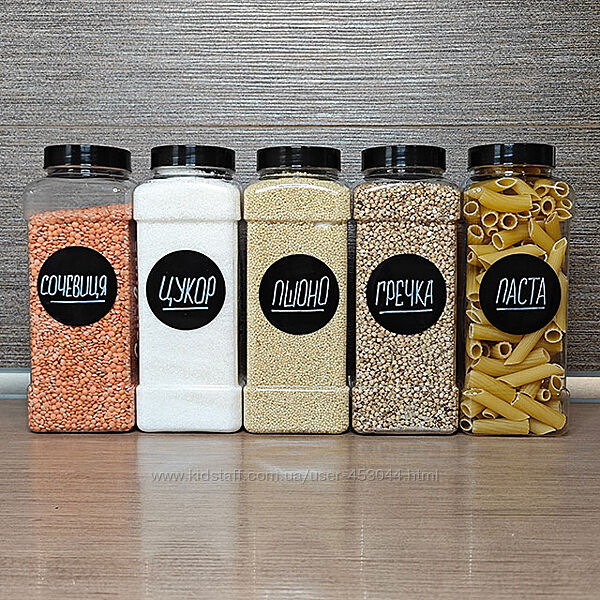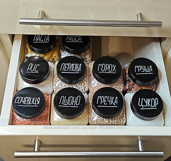 Дані наліпки можна застосовувати не тільки для баночок або пляшок на кухні, також можна використовувати на коробках та контейнерах в гаражі або коморі, щоб не забути, що там зберігається.