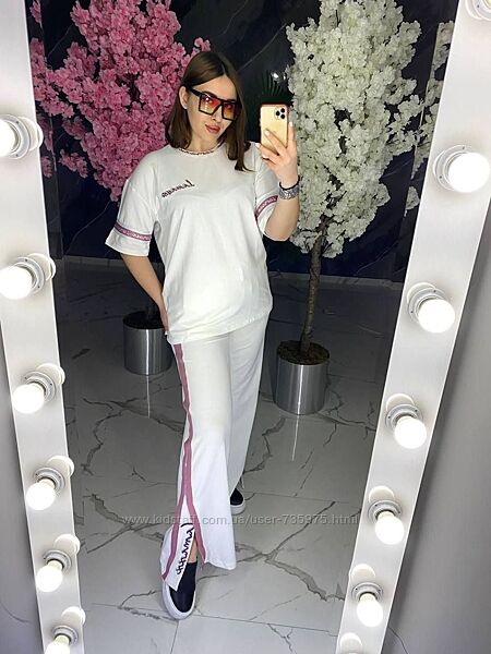 Фото 8-10. Жіночий ультрамодний костюм на літо білого кольору. Широкі штани Палаццо та футболка вільного крою зробить Вас неймовірною красунею. Розміри 56, 58.