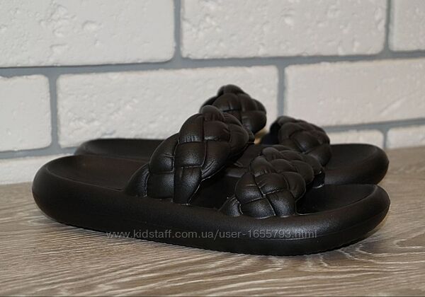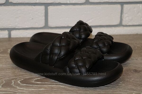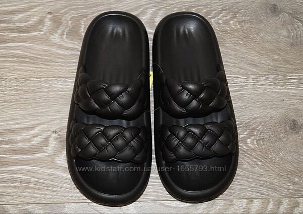 Трендові жіночі шльопанці, литі, у чорному кольорі.Мяка, зручна колодка дозволяє носити шльопанці як у повсякденних справах, так і на відпочинку.