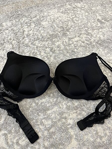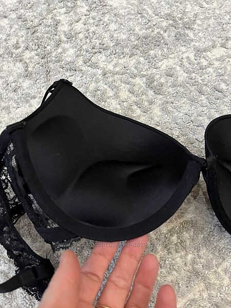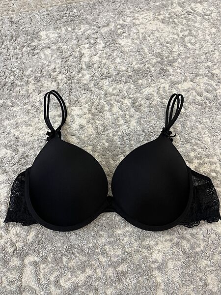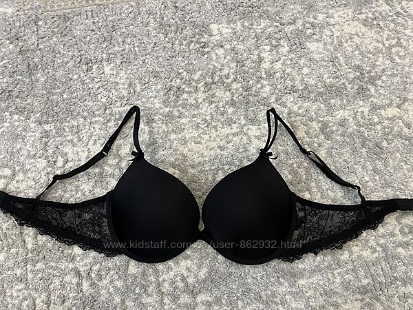 В продаже черный базовый гладкий бюстгальтер шведской марки H&M модель SUPER PUSH-UP BRA,размер 80 В-С.Двойной пуш ап визуально увеличивает грудь на размер-два.Приподнимает грудь и делает аппетитное декольте.Несъемные раздвоенные бретели придают бюсту нотку романтизма.