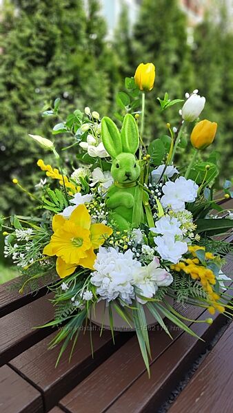 Весняна композиція в біло-жовтих кольорах з зеленим флокованим кроликом. Основа-пластикове кашпо яке має розкладні ніжки. Оплата-100% на картку або післяплата (передоплата 150грн.). Доставка за рахунок отримувача: бажано Новою Поштою (інші варіанти під час обговорення). Зроблено з любов’ю та гарним настроєм. Повернення немає.Другие объявления продавца