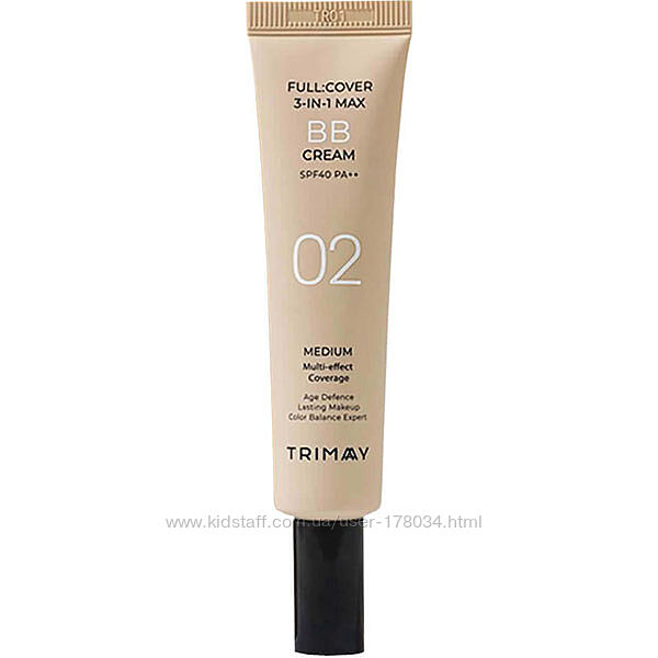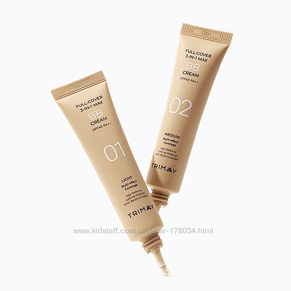 Лёгкий BB-крем Trimay Full Cover 3-in-1 Max BB Cream SPF40 PA++ обеспечивает естественное тонирующее покрытие, которое увлажняет и смягчает, при этом не утяжеляет кожу. Маскирует несовершенства тона, не создаёт эффекта маски на лице, замедляет процесс старения и обеспечивает дополнительную защиту от солнца благодаря физическим и новым химическим УФ-фильтрам в составе. Содержит ниацинамид, гиалуроновую кислоту, аденозин, комплексы INFlazyme-HYF и Skinpia 10, церамиды, экстракты солодки и центеллы.Основные действующие компоненты: