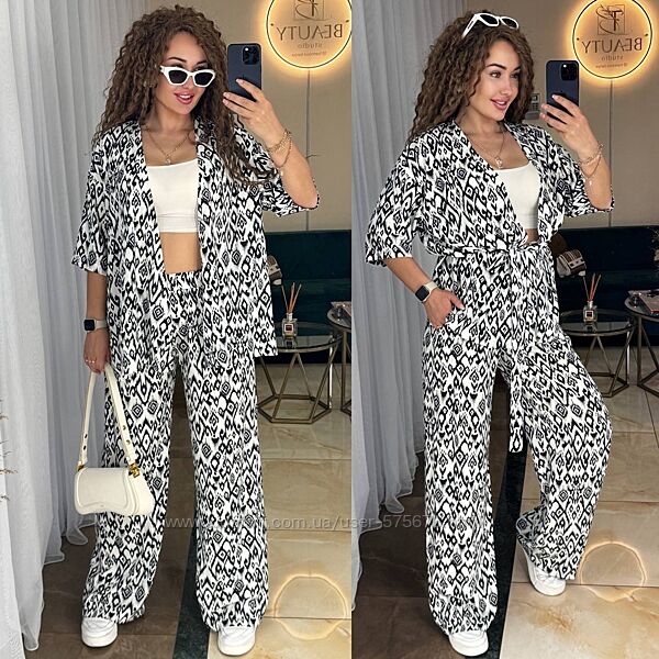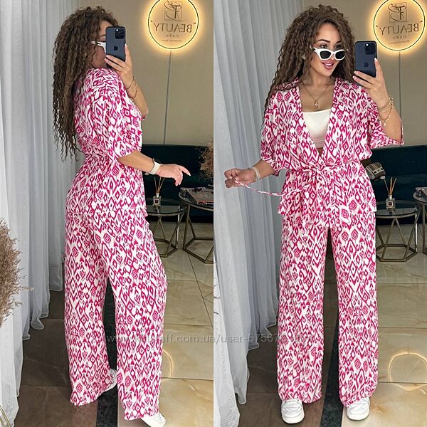 Костюм кофта вільного прямого крою, штани посадка середня, з кишенями, вільного крою. Пояс йде окремо, не пришитий.Тканина штапель