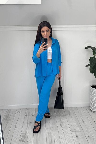 Костюм сорочка + штани. Сорочка вільного крою, рукав застібається на ґудзик, комір стійка. Штани вільного крою, посадка середня, з двома кишенями, талія на резинці