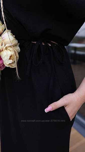 Лляна сукня вільного стилю з оригінальними вирізами по боках на лінії талії які фіксуються затяжками.Має відкладний комір з лацканами.