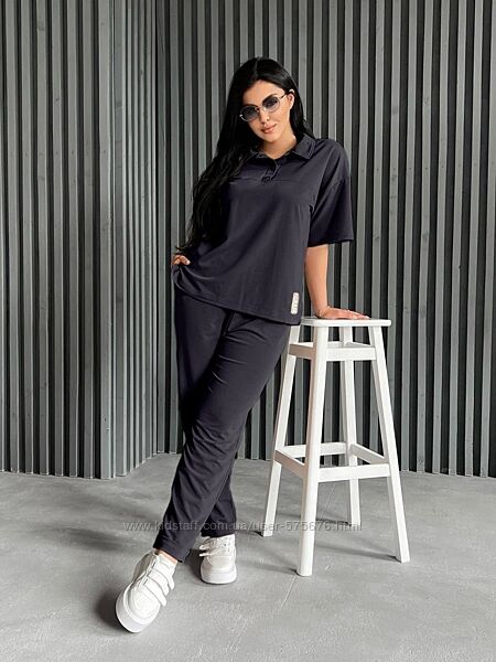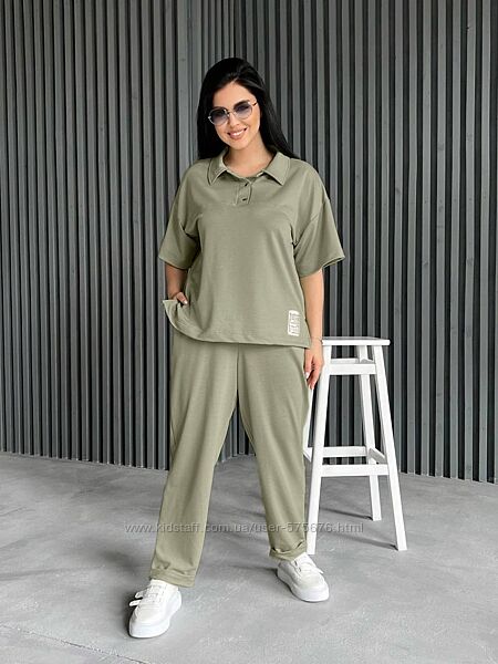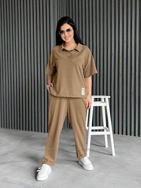 Комфортний прогулянковий костюм з двонитки: брюки та футболка. Брюки мають дві кишені та оздоблені манжетом, пояс на резинцi. Футболка оздоблена нашивкою та двома розрізами по боках, рукав спущений, горловинка застiбається на кнопки та має вilдкладний комiрець.Тканина – двонитка