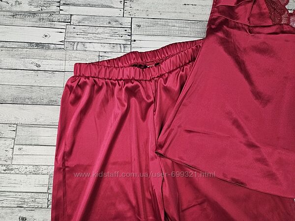 Дивовижний жіночий комплект із сатину і мережива, що складається з майки і штанів для дівчат з невеликим і середнім розміром грудей.Майка напівприлягаючого силуету: