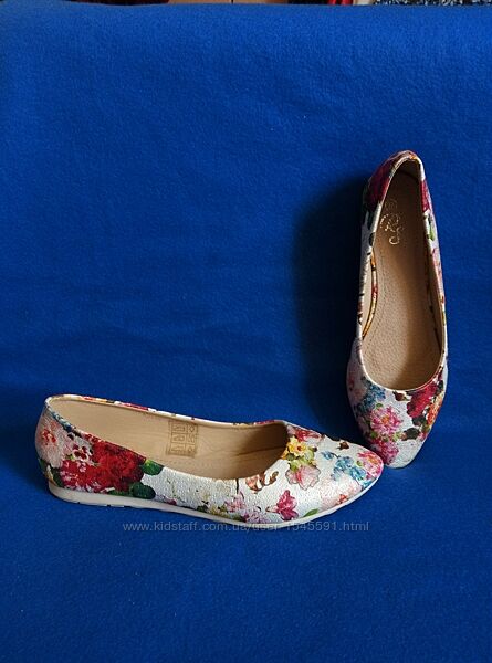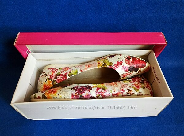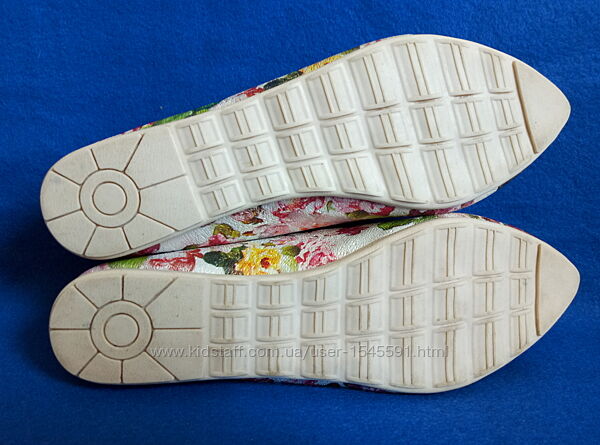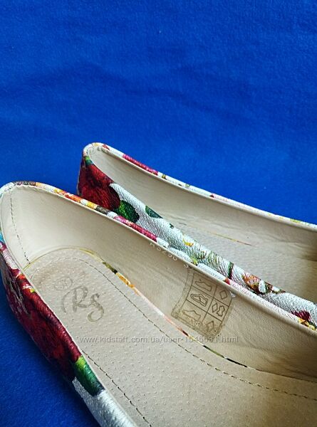 --Балетки туфлі бренду Red Sun в новому стані. Взуті двічі в приміщенні. Всередині прозора наліпка, як зазвичай на новому взутті. В рідній коробці.--Дуже красивий квітковий принт. А зверху ніби срібне напилення. Зблизька фактура на фото 5.
