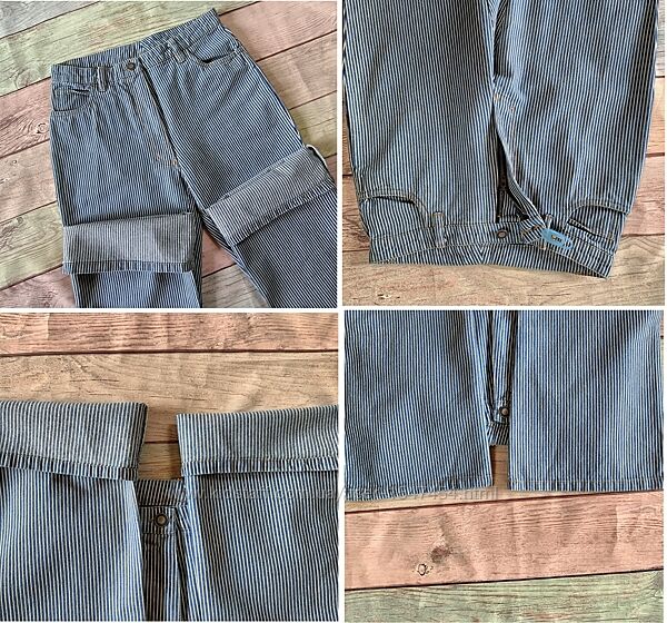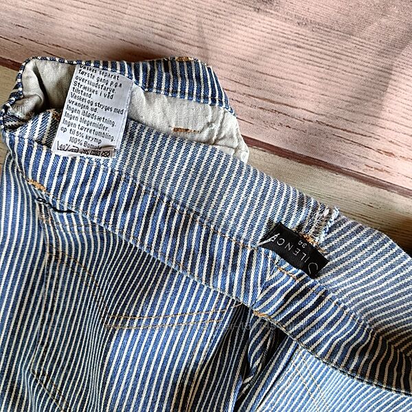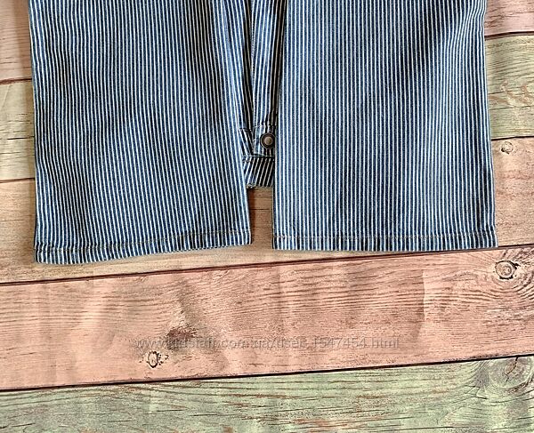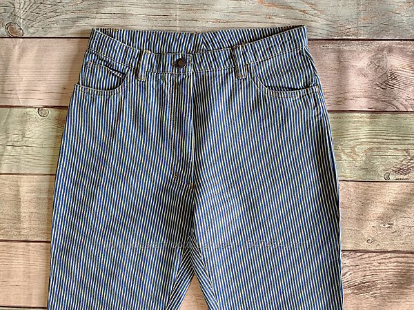 Сезон - весна, лето. Классический крой с легким клешем. Средняя посадка. 100% хлопок средней плотности. Мелкая полоска. Размер указан 34.Длина – 105/81 - шаг