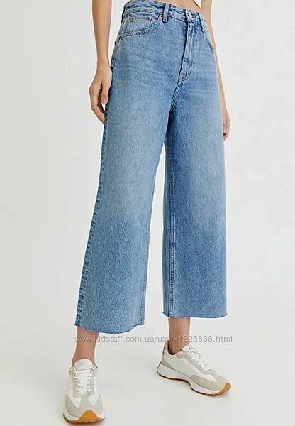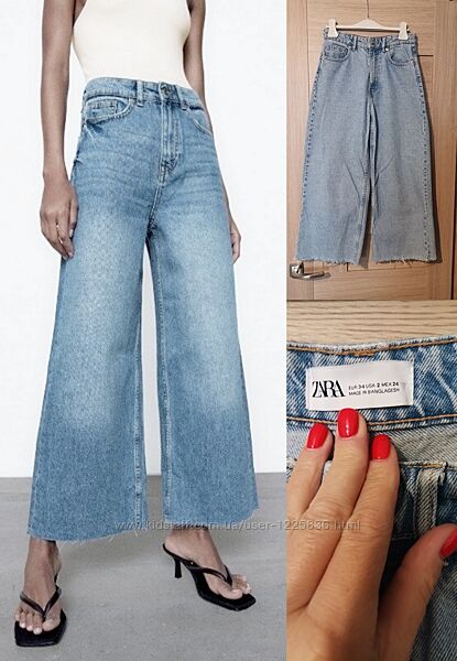 Свободные джинсы-кюлоты посадки Wide Fit с широкими укороченными штанинами. Модель бренда ZARA CULOTTE характерна завышенной талией в повседневном дизайне с пятью карманами и необработанными краями штанин. Джинсы в подходящем для лета светло-голубом цвете. Выполнены из высококачественного денима, состоящего - 100% хлопка в идеальном состоянии ! Размер EUR-34 Замеры по верху изделия: ПОТ- 34 см ПОБ - 40 см Длина по боковому шву - 90 см Шаг - 60 см Посадка : 30/36 --- Доставка : Новая Почта Предоплата 100% Без возврата, обмена, торга!