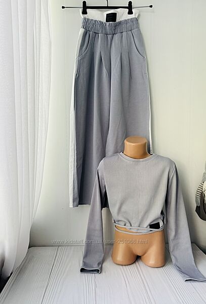 Красивый костюм, кофточка идёт немного укороченная и завязками вкруговую на талии завязывается, штаны с высокой талиейКофточка ткань в рубчик, штаны гладкая ткань как футболка