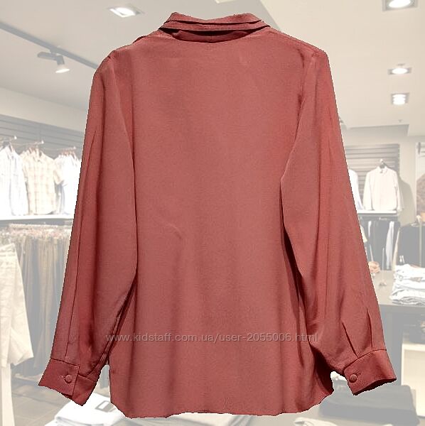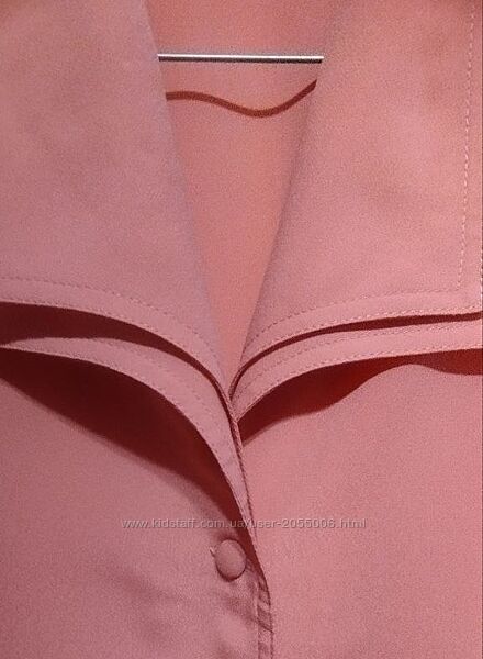 Красива, ошатна блузка абрикосовогокольору, прямого крою, є підплічники. Подвійний відкладний комір, з боків -розрізи. Бірки зі складом тканини зрізані, за відчуттями - поліестер. Стан