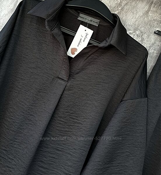 Блузка: свободный силуэт, рубашечный стояче-отложной воротник, плечовой шов приспущен, спереди предусмотрена неглубокая складка.